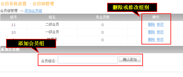 这里可以删除、修改会员组,可以添加会员组,输入会员组名后点击“确认添加”。